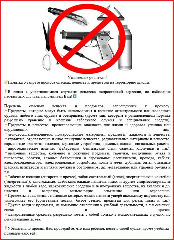 Памятка о запрете проноса опасных веществ и предметов на территорию школы.